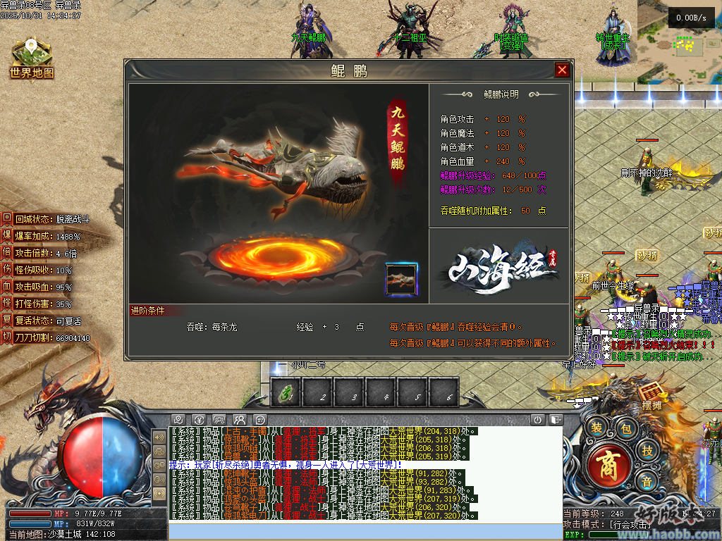 王城属性:刀刀切割+8888 自动回收, 回收1.5倍 ,自动分解, 爆率+100%
