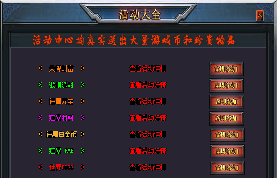 活动:天降财富-激情派对-狂暴元宝-狂暴材料-狂暴RMB-世界BOSS.