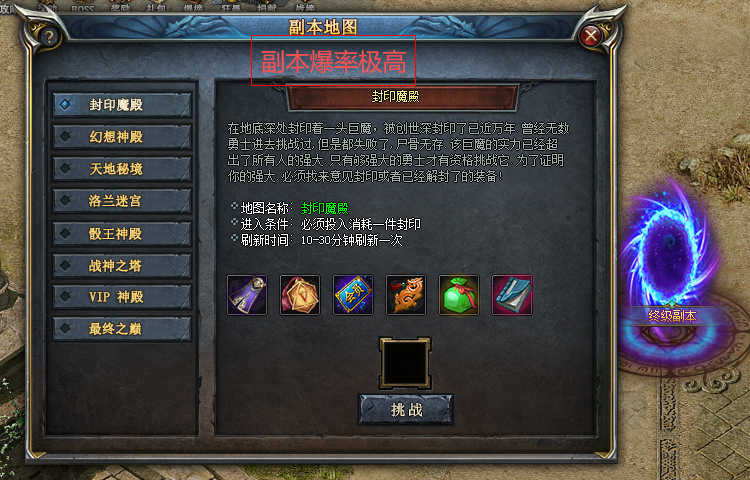 封印魔殿:需要一件封印的装备才可以进入。