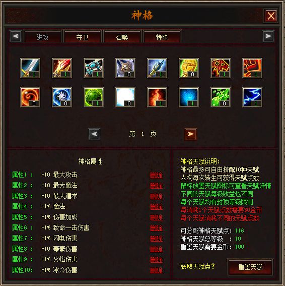 神格天赋说明多可自由搭配10种天赋,人物每次转生可获得天赋点数